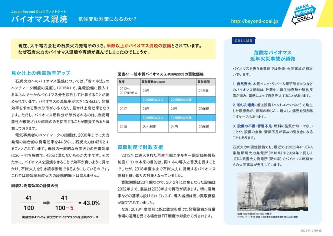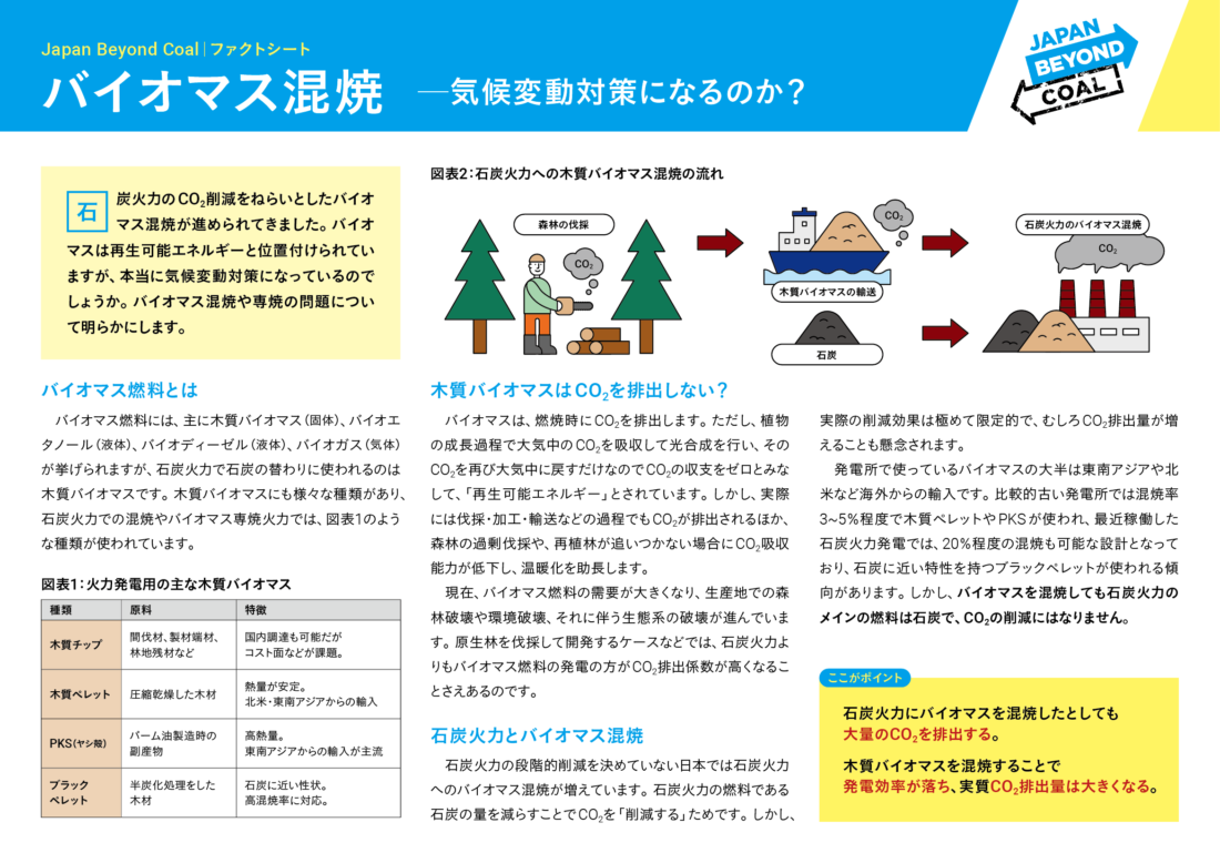 石炭火力のCO2削減をねらいとしたバイオマス混焼が進められてきました。バイオマスは再生可能エネルギーと位置付けられていますが、本当に気候変動対策になっているのでしょうか。バイオマス混焼や専焼の問題について、ファクトシートにまとめました。(PDFダウンロード)
