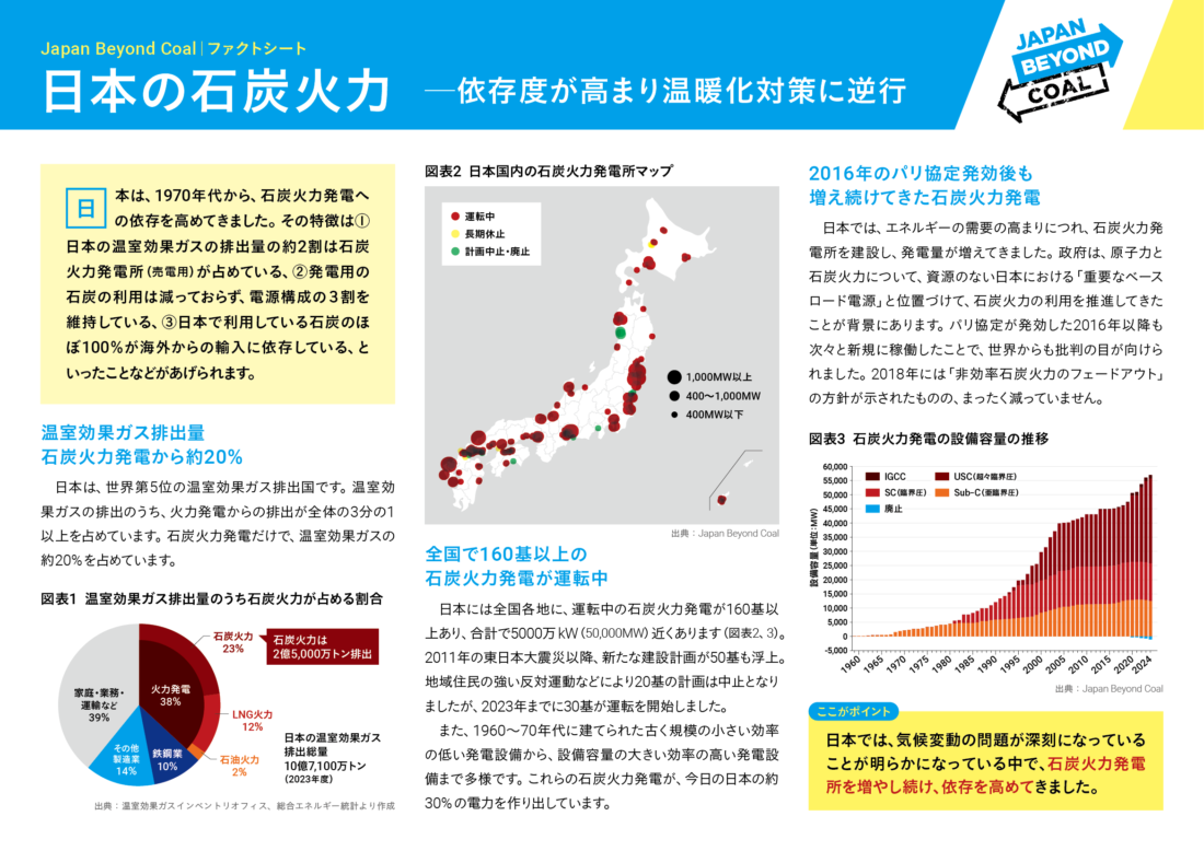 日本の石炭火力発電所が過去30年以上、増え続けてきた状況を解説するファクトシートです。(