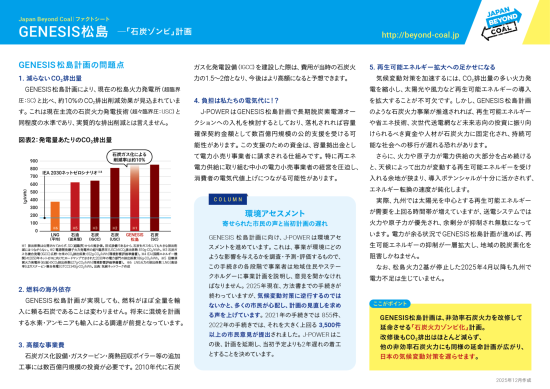 GENESIS 松島計画は、電源開発株式会社(J-POWER)が長崎県西海市の松島で進めている、老朽化した石炭火力発電所の改修計画です。本来はすぐに廃止すべき老朽化した非効率石炭火力を蘇らせる計画であり、改修後も大量のCO2が排出されることから、環境団体などから「石炭ゾンビ」だと批判されています。GENESIS松島計画の問題について、ファクトシートにまとめました。(PDFダウンロード)
