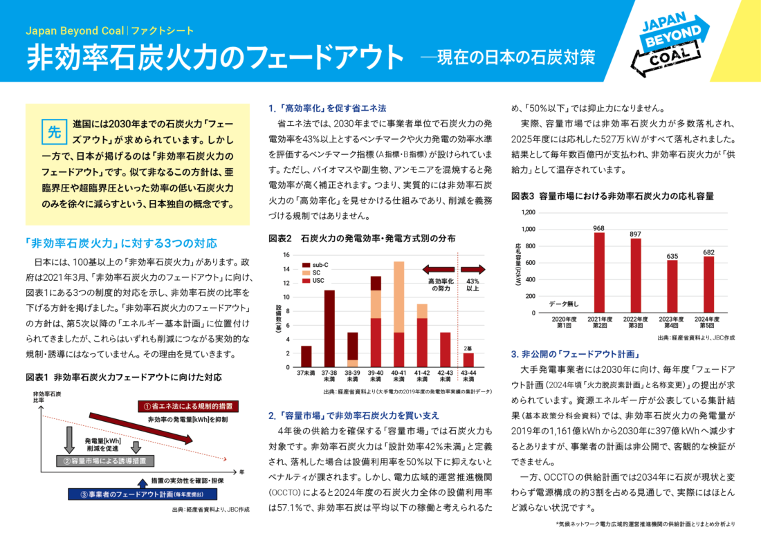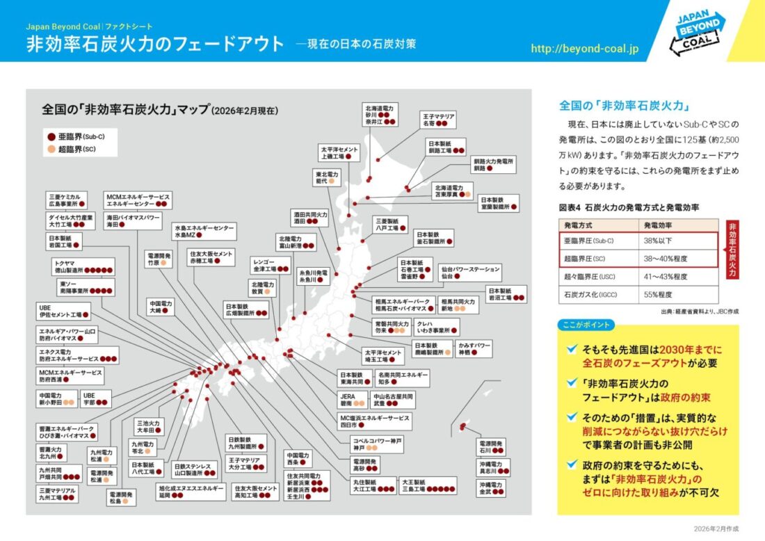 先進国には2030年までの石炭火力「フェーズアウト」が求められています。しかし一方で、日本が掲げるのは「非効率石炭火力のフェードアウト」です。似て非なるこの方針は、亜臨界圧や超臨界圧といった効率の低い石炭火力のみを徐々に減らすという、日本独自の概念です。この問題について、ファクトシートにまとめました。(PDFダウンロード)