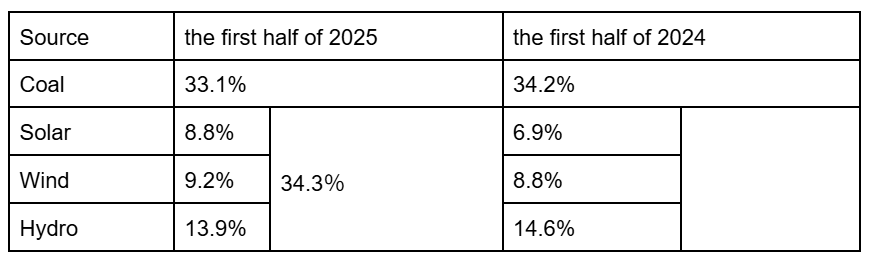 - A strong rise in solar, and to a lesser extent wind, led to renewables overtaking coal generation for the first time on record in the first half of 2025. Renewables grew by 363 TWh (+7.7%) to reach 5,072 TWh, while coal generation fell by 31 TWh to 4,896 TWh. As a result, renewables’ share of global electricity rose to 34.3% (from 32.7%), while coal’s share fell to 33.1% (from 34.2%).