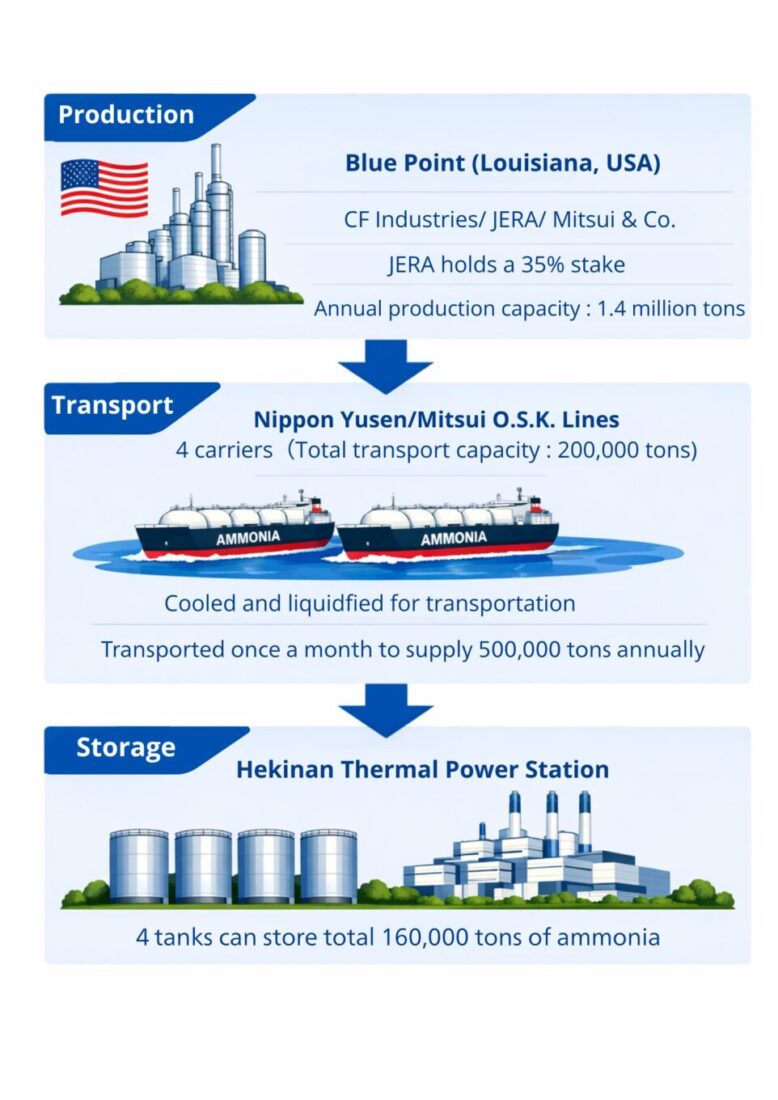 JERA is promoting a plan to establish a supply network by FY2029 to supply low-carbon ammonia produced in Louisiana, USA, for Hekinan Thermal Power Station (Hekinan City, Aichi Prefecture) serving as the receiving hub.