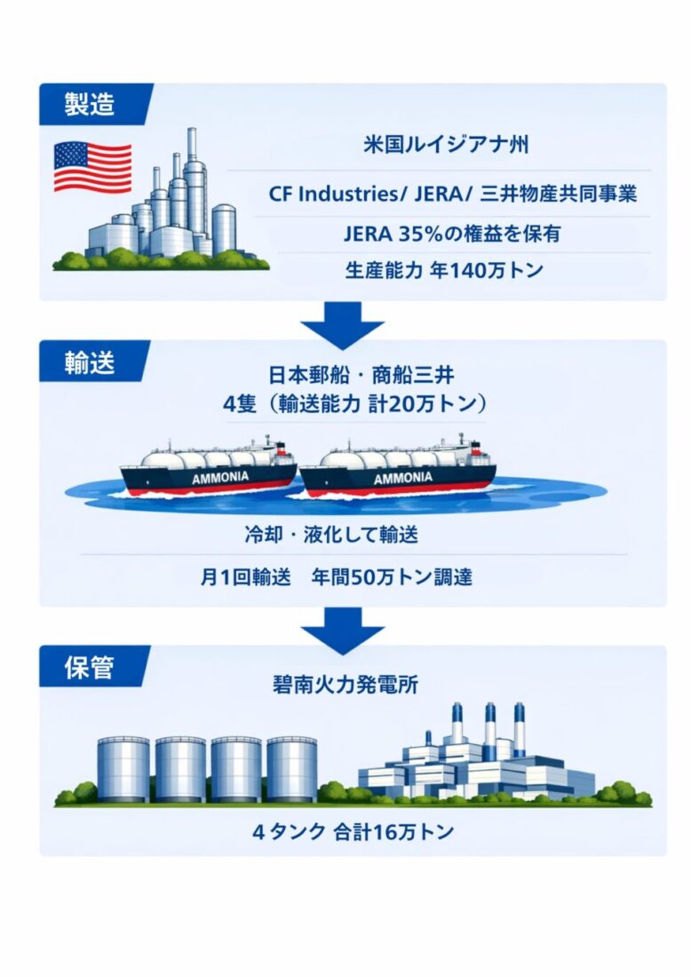 JERAは、米国ルイジアナ州から低炭素アンモニアを日本に輸送し、碧南火力発電所(愛知県碧南市)を受入れ拠点とする供給網を2029年度までに整備する計画を進めています。