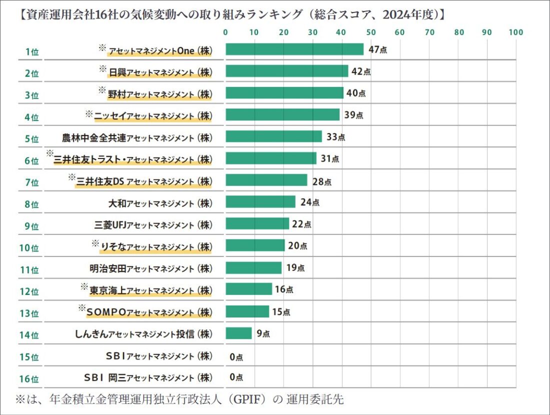 問題は、この外部の資産運用会社が国民の年金積立金を気候変動を悪化させる方向に運用しているということです。A SEED JAPANは大手資産運用会社16社の気候変動対策のスコアリングを実施しましたが、最高点をとったアセットマネジメントOneでも100点満点中47点と非常に低い結果となりました(GPIFから委託を受けるのは図のオレンジマーカーの企業)。
