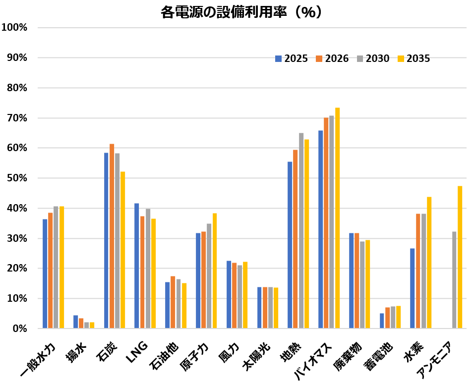 昨年度は容量市場の稼働抑制措置によって、非効率石炭火力においては設備利用率を50%未満に抑える措置が始まりました。そのため、今回示される実績で石炭火力全体でも設備利用率が低下することを予想していました。しかし、2025年度実績における石炭火力全体の設備利用率の低下は見られず、むしろ2024年度実績と比べて微増しています。非効率石炭火力の稼働抑制措置があまり効いていなかったか、それ以外の石炭火力の設備利用率の増加で相殺された可能性があります。稼働抑制処置の効果を判断するには、個々の設備利用率を比較する必要がありそうです。なお、中東情勢の緊迫化に伴うLNGの供給懸念に対応するため、2026年度はこの稼働抑制措置は行われないとの方針が示されています。